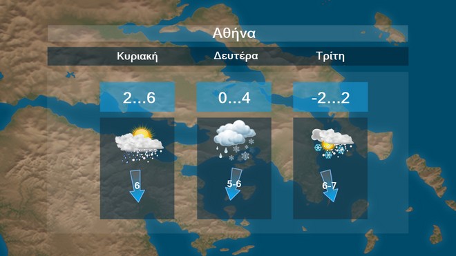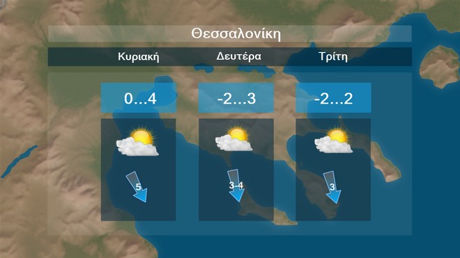 Στα νησιά του βόρειου και ανατολικού Αιγαίου, τις Σποράδες, την Εύβοια, τις Κυκλάδες, την Κρήτη και τα Δωδεκάνησα προβλέπονται βροχές ή χιονόνερο και χιονοπτώσεις στα ορεινά και ημιορεινά καθώς και σε πεδινές περιοχές στα κεντρικά και βόρεια, οι οποίες στην Εύβοια, τις Σποράδες, τις Κυκλάδες και την Κρήτη θα είναι κατά διαστήματα πυκνές. Στο Ιόνιο, τη δυτική και κεντρική Μακεδονία, την Ήπειρο, τη δυτική Στερεά και τη δυτική Πελοπόννησο σχεδόν αίθριος καιρός. Στην υπόλοιπη χώρα προβλέπονται λίγες νεφώσεις παροδικά αυξημένες με παροδικές χιονοπτώσεις ή χιονόνερο. Οι άνεμοι θα πνέουν βόρειοι βορειοδυτικοί 4 με 6 και πρόσκαιρα τοπικά 7 μποφόρ. Η θερμοκρασία θα κυμανθεί σε πολύ χαμηλά επίπεδα και δε θα ξεπεράσει στις περισσότερες περιοχές τους 04 με 06 βαθμούς Κελσίου. Παγετός θα σημειωθεί στα ηπειρωτικά, ο οποίος τις πρωινές και βραδινές ώρες στα βορειοδυτικά θα είναι ισχυρός. Η ελάχιστη θερμοκρασία σε πολλές ηπειρωτικές περιοχές θα κυμαίνεται μεταξύ -06 και -08 βαθμών ενώ κατά τόπους στα βορειοδυτικά θα είναι -15 βαθμοί Κελσίου.