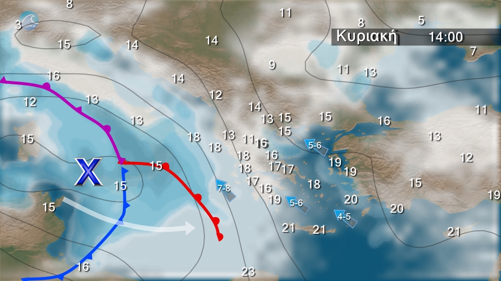 Οι άνεμοι θα πνέουν, στα δυτικά από δυτικές διευθύνσεις 3 με 5 μποφόρ. Στα ανατολικά από νότιες διευθύνσεις με την ίδια ένταση και στο Αιγαίο τοπικά 6 μποφόρ. Η θερμοκρασία θα σημειώσει μικρή πτώση στα βόρεια και θα φτάσει τους 18 βαθμούς στα βόρεια, στα υπόλοιπα ηπειρωτικά και το Ιόνιο τους 20 με 21και στα νησιά του Αιγαίου τους 22 με 23 βαθμούς Κελσίου.