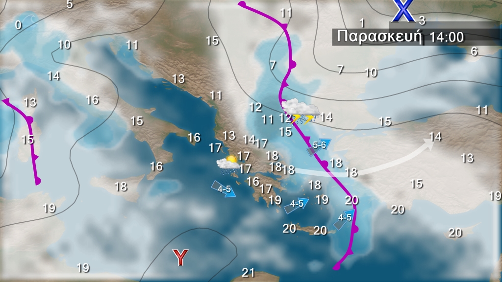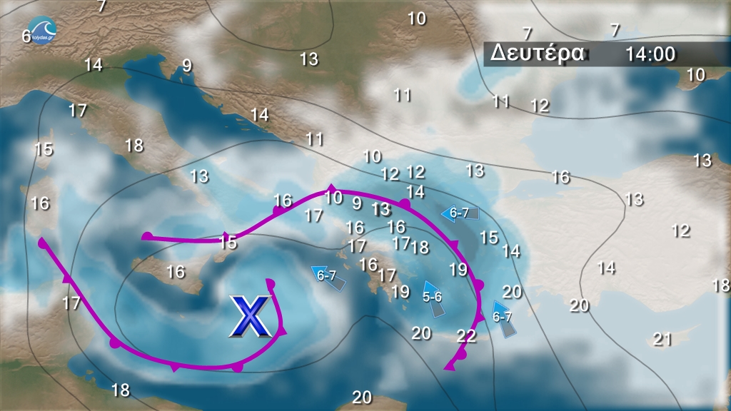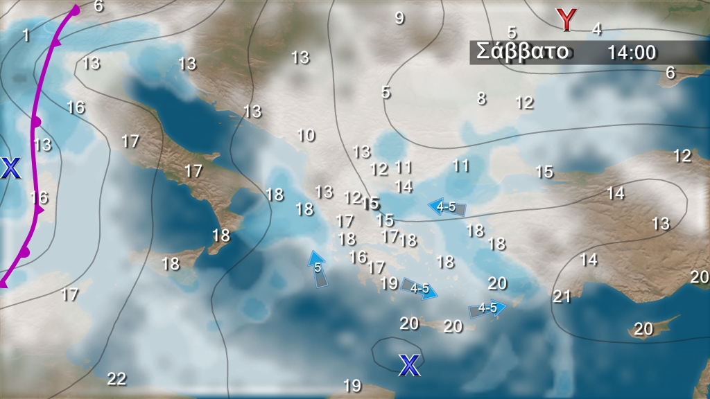 Νεφώσεις με βροχές και σποραδικές καταιγίδες πιθανώς κατά τόπους ισχυρές στις περισσότερες περιοχές της χώρας. Βαθμιαία από τα δυτικά τα φαινόμενα θα εξασθενήσουν. Οι άνεμοι θα πνέουν στα βόρεια από ανατολικές διευθύνσεις 4 με 6 και βαθμιαία στο βόρειο Αιγαίο 7 και πιθανώς τοπικά 8 μποφόρ που τη νύχτα θα εξασθενήσουν. Στα υπόλοιπα από νότιες διευθύνσεις 5 με 7 και στα πελάγη τοπικά 8 μποφόρ που βαθμιαία από τα δυτικά θα στραφούν σε νοτιοδυτικούς και θα εξασθενήσουν.