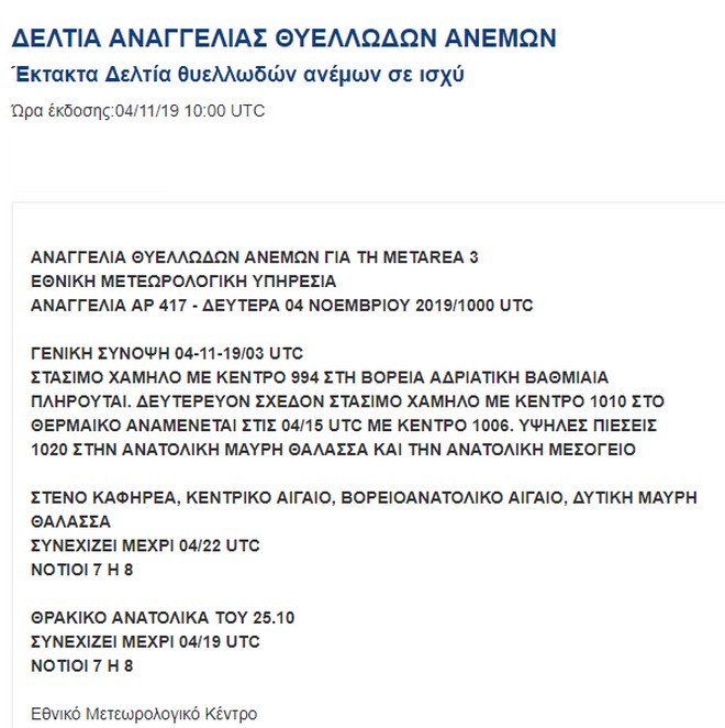Υπενθυμίζεται ότι η ΕΜΥ εξέδωσε Έκτακτο Δελτίο Επιδείνωσης καιρού, όπου αναφέρεται ότι από τις απογευματινές ώρες της Δευτέρας μέχρι και το πρωί της Τρίτης η κακοκαιρία θα επηρεάσει τη Θράκη, τα νησιά του ανατολικού Αιγαίου και τα Δωδεκάνησα, ενώ τη Δευτέρα τέθηκε σε ισχύ και Δελτίο προειδοποίησης θυελλωδών ανέμων.