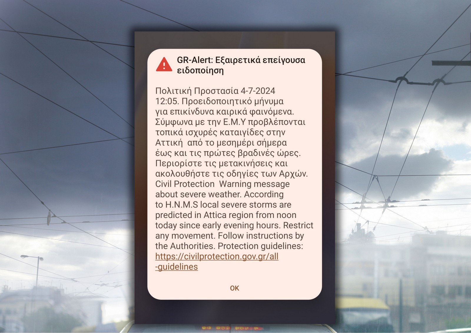 Μάλιστα, λίγο μετά τις 12 ήχησε και το 112, προειδοποιώντας για ισχυρές βροχοπτώσεις στην Αττική από το μεσημέρι έως τις πρώτες βραδινές ώρες και καλώντας τους πολίτες να περιορίσουν τις μετακινήσεις τους.