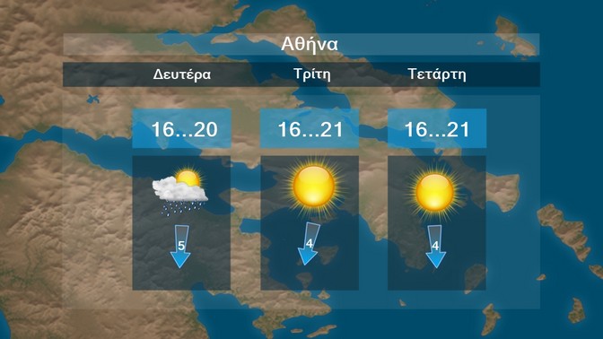 Στην Αθήνα λίγες βροχές τη Δευτέρα βελτιούμενος. Η θερμοκρασία θα κυμαίνεται περί τους 20 με 21 βαθμούς Κελσίου.