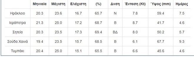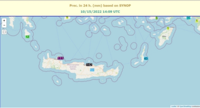 Πολύ μεγάλα ύψη βροχής, τρεις φορές από την βροχή που πέφτει όλο το μήνα κατέγραψαν πολλοί σταθμοί της Κρήτης με πιο χαρακτηριστικές περιπτώσεις την περιοχή του Ηρακλείου με 142mm, τα οποία σημειώθηκαν σε ένα μόλις 6ωρο καιτων Χανίων με 111 mm βροχής.