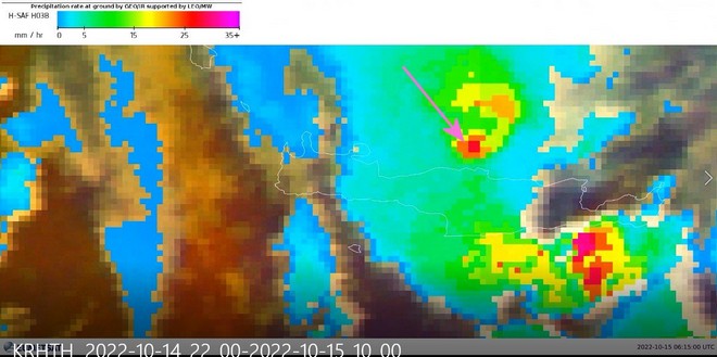 Στην παραπάνω δορυφορική φωτογραφία μπορούμε να διακρίνουμε τον πυρήνα της καταιγίδας που είχε ραγδαιότητα πάνω από 25 mm/h βροχής. Γεγονός είναι ότι ενώ οι μετρήσεις από τους δορυφόρους μας βοηθούν σε περιοχές που δεν υπάρχουν σταθμοί, οι μετρήσεις τους υπολείπονται των αντίστοιχων επιφανειακών μετεωρολογικών σταθμών. Αυτό το παρατηρήσαμε και το πρωί στην περιοχή των Χανίων που σημειώθηκαν 100mm βροχής, ενώ στη θαλάσσια περιοχή Κυθήρων Κρήτης είχαμε 160mm.