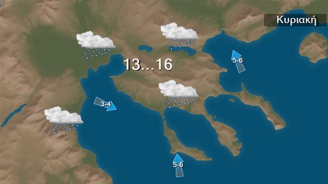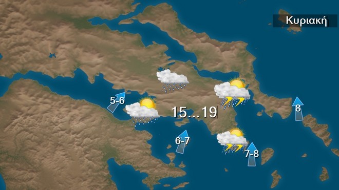 Την Κυριακή προβλέπονται βροχές και καταιγίδες στο μεγαλύτερο μέρος της χώρας. Τα φαινόμενα, που θα είναι κατά τόπους και κατά περιόδους ισχυρά από το απόγευμα και από τα δυτικά βαθμιαία θα εξασθενήσουν. Λίγα χιόνια θα πέσουν στα βορειοδυτικά ορεινά. Οι άνεμοι θα πνέουν από νότιες διευθύνσεις 6 με 8 και στο Αιγαίο τοπικά έως 9 μποφόρ. Βαθμιαία θα στραφούν σε δυτικών διευθύνσεων 5 με 7 μποφόρ. Η θερμοκρασία θα σημειώσει πτώση ως προς τις μέγιστες τιμές. Η θερμοκρασία θα παραμείνει σε υψηλά για την εποχή επίπεδα. Στα βόρεια θα φτάσει τους 15 έως 18 βαθμούς, στις υπόλοιπες περιοχές τους 19 έως 20 βαθμούς, τοπικά στη βόρεια Κρήτη έως 21 βαθμούς Κελσίου.