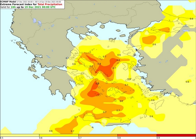 Extreme Forecast Index (EFI) που αφορά τα ύψη βροχής