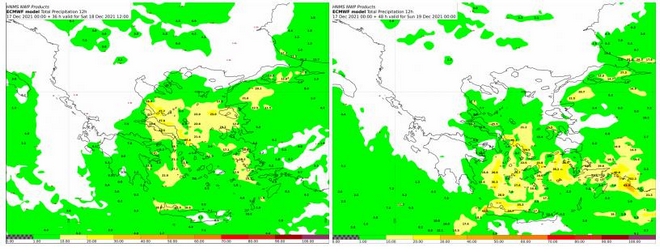 Αυτό παρουσιάζεται ευκρινέστερα και με τα ύψη 12ωρου υετού για το Σάββατο (18/12) στους δύο χάρτες που ακολουθούν. Ο πρώτος χάρτης αναφέρεται στο χρονικό διάστημα μέχρι το μεσημέρι και ο επόμενος μέχρι και τις βραδινές ώρες του Σαββάτου (18/12).