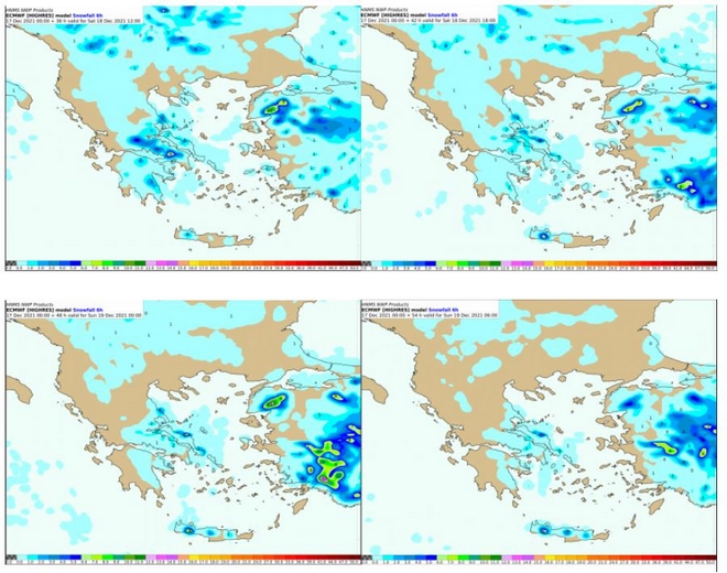 Ο δείκτης επικινδυνότητας των ποσοτήτων υετού (κατ’ επέκταση και των χιονοπτώσεων) δεν και τα μεγαλύτερα ύψη βροχής εντοπίζονται κυρίως πάνω από τις θαλάσσιες περιοχές του Κεντρικού και του Νότιου Αιγαίου.