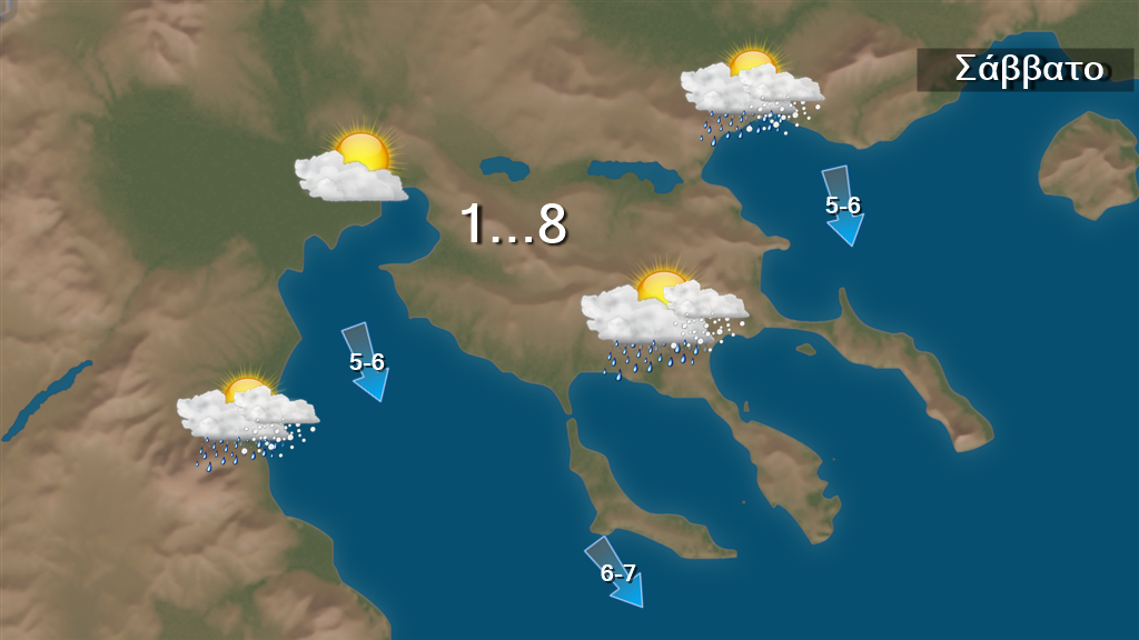 Σήμερα Σάββατο στα βορειοδυτικά προβλέπονται λίγες νεφώσεις πρόσκαιρα αυξημένες. Στην υπόλοιπη χώρα θα επικρατήσει κακοκαιρία με βροχές, χιονόνερο στα κεντρικά και τα βόρεια και σποραδικές καταιγίδες τοπικά ισχυρές στα ανατολικά και νότια κυρίως θαλάσσια και παραθαλάσσια τμήματα. Χιονοπτώσεις θα σημειωθούν στα ορεινά της ηπειρωτικής χώρας και της Κρήτης, αλλά και σε περιοχές με χαμηλότερο υψόμετρο στα κεντρικά και βόρεια, κατά τόπους πυκνές στα ορεινά – ημιορεινά της ανατολικής Θεσσαλίας, Εύβοιας, ανατολικής Στερεάς και ανατολικής Πελοποννήσου.