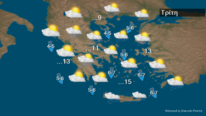 Οι άνεμοι θα πνέουν από βόρειες διευθύνσεις, στα δυτικά 4 με 6 και στα ανατολικά 5 με 7 και στο Αιγαίο αρχικά 8 με 9 μποφόρ με βαθμιαία εξασθένηση. Η θερμοκρασία θα κυμανθεί σε χαμηλά επίπεδα και δεν θα ξεπεράσει στα βόρεια τους 06 με 08 βαθμούς, στο Ιόνιο και τα υπόλοιπα ηπειρωτικά τους 09 με 11 βαθμούς, ενώ στο νότιο Αιγαίο θα φτάσει τους 13 βαθμούς Κελσίου. Τις πρωινές και βραδινές ώρες θα σημειωθεί παγετός στα ηπειρωτικά, ο οποίος στα βόρεια θα είναι κατά τόπους ισχυρός με τον υδράργυρο τοπικά στους -8 βαθμούς Κελσίου.
