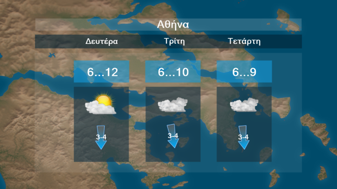Στην Αθήνα προβλέπονται τοπικές νεφώσεις παροδικά αυξημένες . Η θερμοκρασία θα έχει μέγιστη τιμή περί τους 9 με 12 βαθμούς Κελσίου