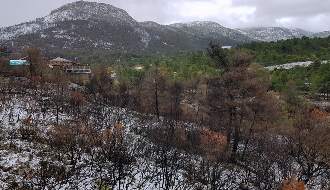 Λευκό είναι το τοπίο στην Πάρνηθα και το πρωί της Κυριακής, καθώς από χθες δεν έχει σταματήσει να χιονίζει. Το χιόνι έχει φτάσει τους 30-35 πόντους περίπου, ενώ ο δρόμος είναι κλειστός για λόγους ασφαλείας.
