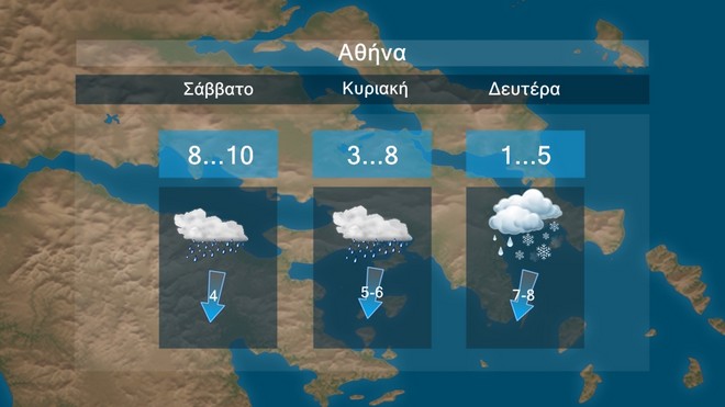 Στην Αθήνα προβλέπονται νεφώσεις με χιονόνερο έως την Κυριακή και τη Δευτέρα χιόνια. Η θερμοκρασία θα πέσει στους 5 βαθμούς Κελσίου τη Δευτέρα.