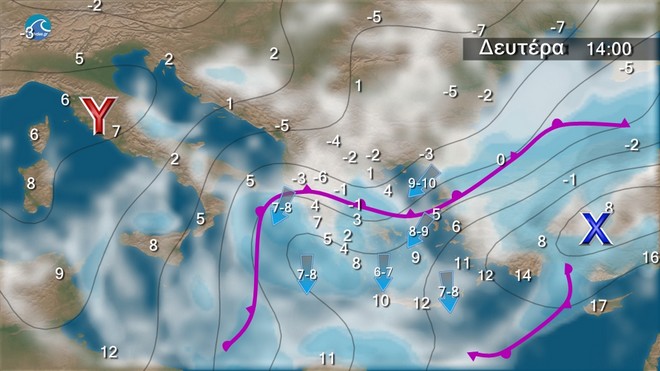 Οι άνεμοι θα πνέουν στα βορειοανατολικά βόρειοι βορειοανατολικοί 5 με 7 και από το βράδυ τοπικά 8 μποφόρ με περαιτέρω ενίσχυση τη νύχτα. Στις υπόλοιπες περιοχές θα πνέουν ανατολικοί νοτιοανατολικοί 5 με 7 και στο βόρειο Ιόνιο από το βράδυ θα στραφούν σε βόρειους 7 με 8 μποφόρ. Η θερμοκρασία θα σημειώσει πτώση, η οποία θα γίνει ιδιαιτέρως αισθητή στα κεντρικά και βόρεια. Παγετός θα σημειωθεί τις πρωινές και βραδινές ώρες στα βόρεια, όπου τις βραδινές ώρες θα είναι κατά τόπους ισχυρός.