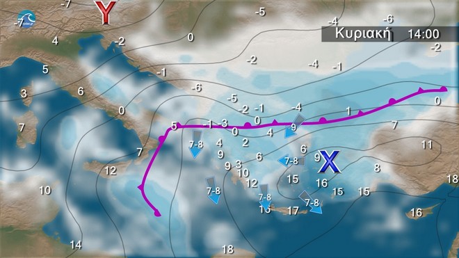 Στη δυτική και βόρεια χώρα παροδικές χιονοπτώσεις με εξασθένηση. Στις υπόλοιπες περιοχές νεφώσεις με χιονόνερο και χιονοπτώσεις, οι οποίες θα είναι κατά τόπους πυκνές στην ανατολική Θεσσαλία, την ανατολική Στερεά, την Εύβοια, τις Σποράδες και στα ορεινά της Κρήτης. Οι άνεμοι θα πνέουν βόρειοι βορειοανατολικοί 7 με 8, στα ανατολικά τοπικά 9 και στο βόρειο Αιγαίο σε επίπεδο θύελλας έως 10 μποφόρ. Η θερμοκρασία θα διατηρηθεί σε πολύ χαμηλά επίπεδα και θα σημειωθεί παγετός, στα κεντρικά και βόρεια ισχυρός. Στα βόρεια ηπειρωτικά θα είναι κατά τόπους ολικός.