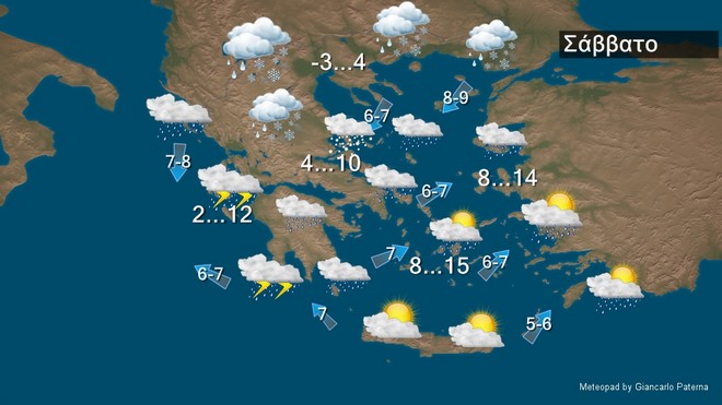 Στα κεντρικά και τα βόρεια στην πρόγνωση του καιρού για το Σάββατο προβλέπονται νεφώσεις με βροχές ή χιονόνερο, στα ορεινά- ημιορεινά χιονοπτώσεις οι οποίες βαθμιαία θα είναι κατά τόπους πυκνές στη δυτική και κεντρική Μακεδονία, τη Θεσσαλία, την κεντρική Στερεά και πρόσκαιρα στην Ήπειρο. Προς το βράδυ θα χιονίσει και σε πεδινές περιοχές της Μακεδονίας και της Θράκης. Στην υπόλοιπη χώρα νεφώσεις με τοπικές βροχές. Σποραδικές καταιγίδες θα εκδηλωθούν στα νησιά του Ιονίου, τη δυτική Στερεά, τη δυτική Πελοπόννησο και τα παραθαλάσσια της Ηπείρου, οι οποίες από το απόγευμα θα είναι κατά τόπους ισχυρές.