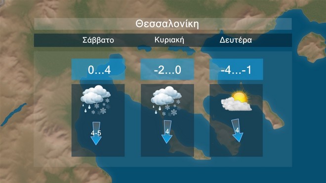Στη Θεσσαλονίκη στην πρόγνωση του καιρού προβλέπονται χιόνια το Σαββατοκύριακο ακόμη και στην πόλη. Η θερμοκρασία από την Κυριακή και μετά δεν θα ξεπεράσει το μηδέν.