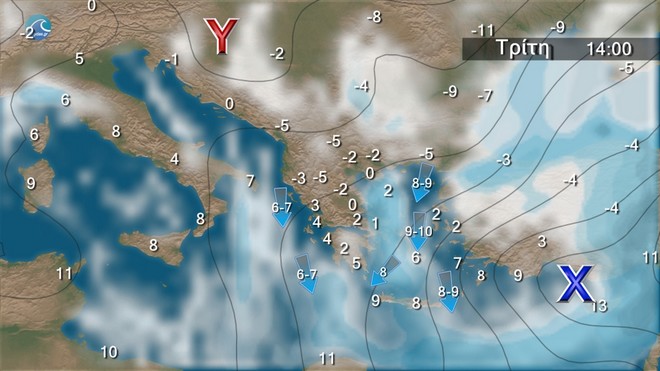Στη δυτική και βόρεια χώρα νεφώσεις παροδικά αυξημένες με ασθενείς χιονοπτώσεις. Στις υπόλοιπες περιοχές νεφώσεις με χιονόνερο και χιονοπτώσεις οι οποίες θα είναι κατά τόπους πυκνές στην ανατολική Θεσσαλία, την ανατολική Στερεά, την Εύβοια, τις Σποράδες τα νησιά του βορείου Αιγαίου και στα ορεινά-ημιορεινά της Κρήτης. Οι άνεμοι θα πνέουν βόρειοι βορειοανατολικοί 7 με 8, στα πελάγη τοπικά 9 μποφόρ και στο Αιγαίο τοπικά έως 10 μποφόρ. Η θερμοκρασία θα διατηρηθεί σε πολύ χαμηλά επίπεδα και θα σημειωθεί παγετός, στα κεντρικά και βόρεια ισχυρός. Στα βόρεια ηπειρωτικά θα είναι κατά τόπους ολικός.