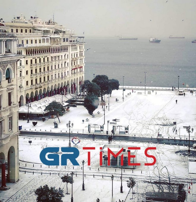 Το χιόνι έχει καλύψει το μεγαλύτερο μέρος της πλατείας Αριστοτέλους στη Θεσσαλονίκη, δημιουργώντας μια εντυπωσιακή εικόνα.