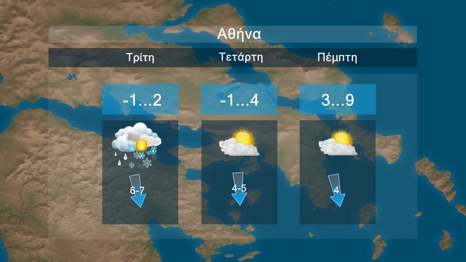 Στην Αθήνα προβλέπονται νεφώσεις με χιονόνερο και χιόνια την Τρίτη και βελτίωση από την Τετάρτη Η θερμοκρασία από τους 2 με 4 βαθμούς την Πέμπτη θα ανέβει στους 9 βαθμούς Κελσίου.