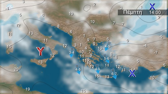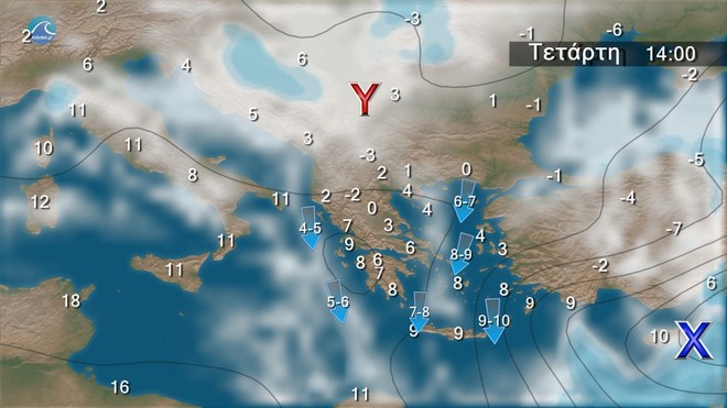 Στα δυτικά γενικά αίθριος καιρός. Στα βόρεια λίγες νεφώσεις, παροδικά αυξημένες με ασθενείς χιονοπτώσεις. Στις υπόλοιπες περιοχές νεφώσεις με χιονόνερο και χιονοπτώσεις οι οποίες θα είναι κατά τόπους πυκνές στην ανατολική Στερεά, την Εύβοια, τις Σποράδες, τα νησιά του βορείου και ανατολικού Αιγαίου, στα ορεινά και ημιορεινά της Κρήτης και βαθμιαία και σε περιοχές της Κρήτης με χαμηλό υψόμετρο. Οι άνεμοι θα πνέουν στα δυτικά βόρειοι βορειοανατολικοί 4 με 6 μποφόρ, που από το μεσημέρι θα στραφούν σε βόρειους βορειοδυτικούς με την ίδια ένταση. Στα ανατολικά θα πνέουν βόρειοι βορειοανατολικοί 7 με 9 και στο Αιγαίο τοπικά έως 10 μποφόρ. Η θερμοκρασία θα διατηρηθεί σε πολύ χαμηλά επίπεδα και θα σημειωθεί παγετός, στα κεντρικά και βόρεια ισχυρός. Στα βόρεια ηπειρωτικά θα είναι κατά τόπους ολικός.