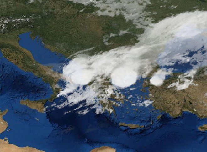 Οι «λευκές μπάλες» της νέφωσης που διακρίνονται στη δορυφορική εικόνα μας δείχνουν τον μεγάλο όγκο των καταιγιδοφόρων νεφών που η μία περιοχή βρίσκεται στο βόρειο Αιγαίο και η άλλη στη Νότια Αδριατική.
