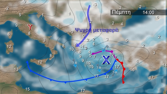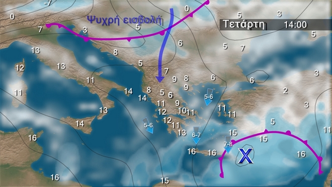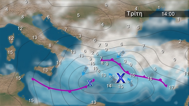 Το βαρομετρικό χαμηλό την Τρίτη θα προκαλέσει επιδείνωση του καιρού σε όλη τη χώρα με βροχές, καταιγίδες κυρίως στα νότια θαλάσσια τμήματα και χιόνια στα ορεινά αλλά και σε ημιορεινές περιοχές. Το σύστημα αυτό θα κινηθεί αργά ανατολικά και θα επηρεάσει κυρίως τα κεντρικά και νότια. Λόγω του ΒΑ ενισχυμένου ρεύματος με εντάσεις ανέμων στα 8 με 9 μπ θα έχουμε πτώση της θερμοκρασίας και αρκετά φαινόμενα στα ανατολικά και νότια.