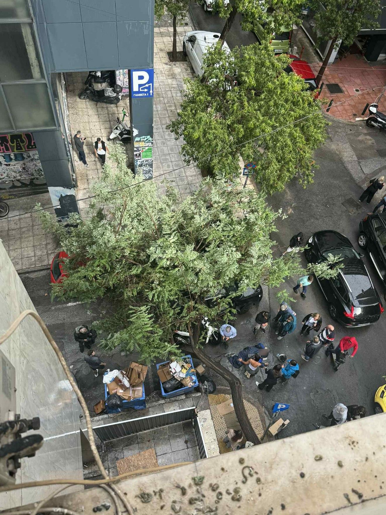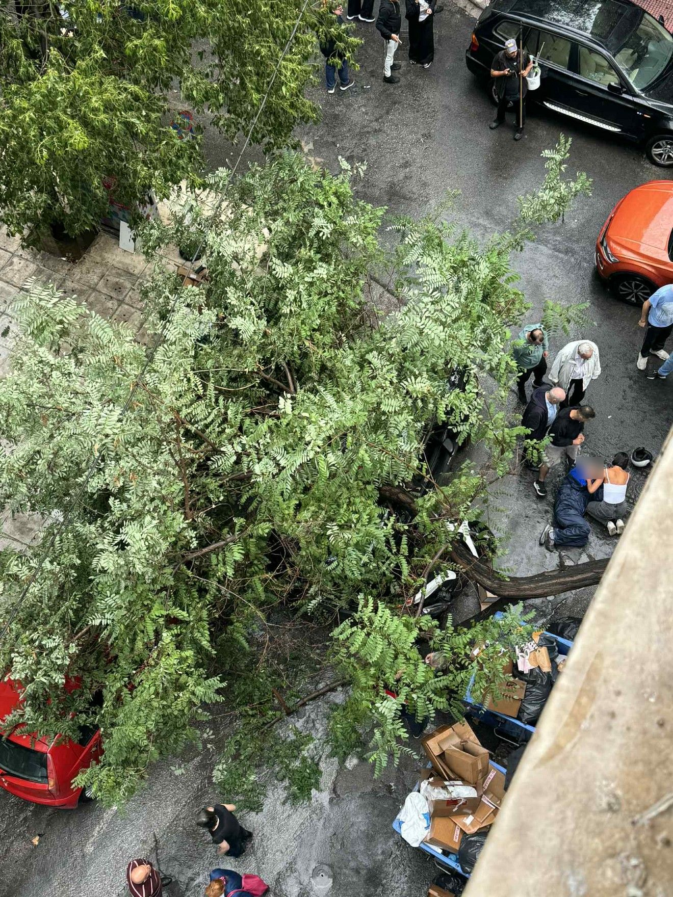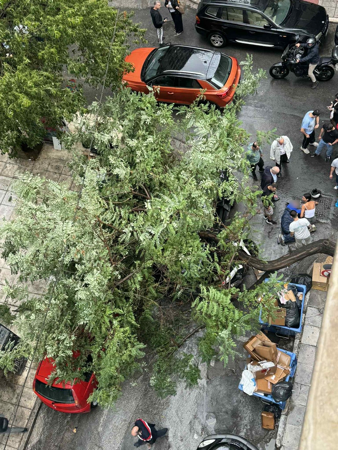 Εξαιτίας της κακοκαιρίας, ένα δέντρο έπεσε στη συμβολή των οδών Μπενάκη και Γαμβέτα στα Εξάρχεια καταπλακώνοντας ένα σταθμευμένο αυτοκίνητο και ένα διερχόμενο μηχανάκι.