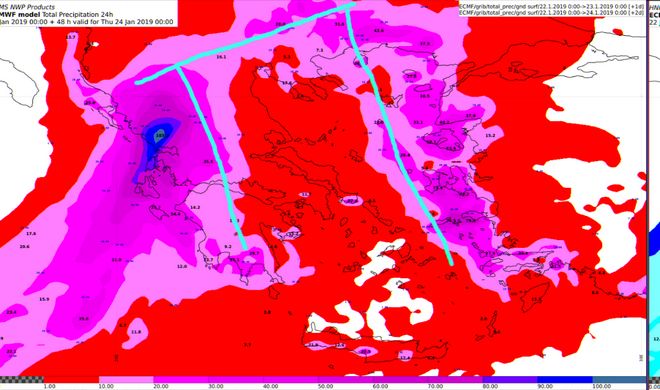 Οι περιοχές που θα επηρεαστούν την Τετάρτη περισσότερο είναι τα ΒΔ καθώς τα 24ΩΡΑ ύψη βροχής φτάνουν τοπικά τα 90 με 100 mm.