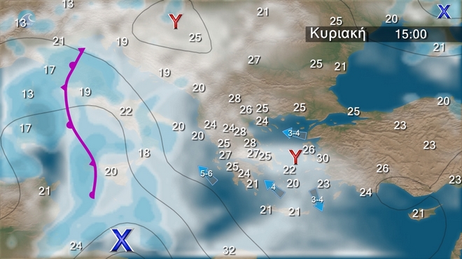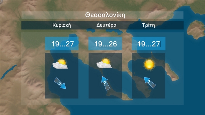 Στις Κυκλάδες, την Κρήτη και τα Δωδεκάνησα αίθριος καιρός. Στην υπόλοιπη χώρα αρχικά αίθριος, βαθμιαία από τα δυτικά θα αναπτυχθούν αραιές νεφώσεις, που τις μεσημβρινές-απογευματινές ώρες θα πυκνώσουν και υπάρχει πιθανότητα θα εκδηλωθούν τοπικοί όμβροι στα ορεινά της Ηπείρου. Ευνοείται η μεταφορά αφρικανικής σκόνης στα δυτικά μετά το μεσημέρι. Οι άνεμοι στα νοτιοανατολικά θα πνέουν από δυτικές διευθύνσεις 3-4 μποφόρ. Στην υπόλοιπη χώρα νότιοι νοτιοανατολικοί 3 με 5 και στο Ιόνιο από το απόγευμα τοπικά 6 μποφόρ. Η θερμοκρασία θα σημειώσει άνοδο στα κεντρικά και νότια.