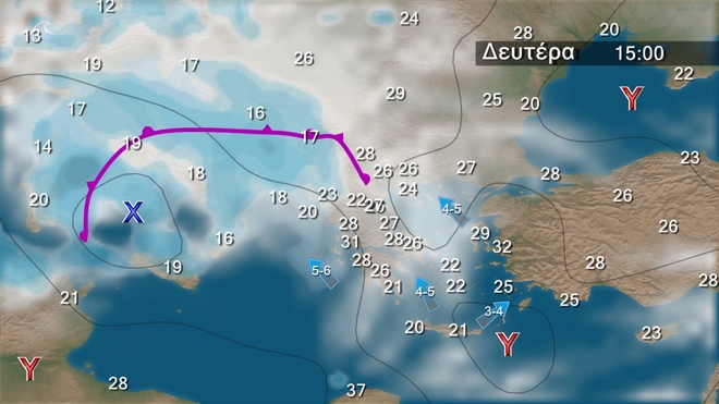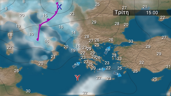Στα δυτικά και βόρεια λίγες νεφώσεις παροδικά αυξημένες με τοπικούς όμβρους ή μεμονωμένες καταιγίδες στα βορειοδυτικά. Στην υπόλοιπη χώρα γενικά αίθριος καιρός. Ευνοείται η μεταφορά αφρικανικής σκόνης με αυξημένες συγκεντρώσεις στα ανατολικά και τα νότια. Οι άνεμοι θα πνέουν από νότιες διευθύνσεις 3 με 5 και στα πελάγη τοπικά 6 μποφόρ. Η θερμοκρασία δε θα σημειώσει αξιόλογη μεταβολή.