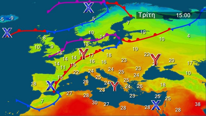 Στον γενικό χάρτη της Ευρώπης διακρίνονται ισχυρά βαρομετρικά χαμηλά στα βορειοδυτικά αλλά και τα δυτικά τμήματα της Ευρώπης κυρίως τα ανατολικά τμήματα της Ιβηρικής και νότια Γαλλία. Ο αντικυκλώνας καλύπτει τα ανατολικά και νότια και εμποδίζει τα συστήματα της βόρειας Ευρώπης να κινηθούν νοτιότερα. Το χαμηλό στις ακτές της Αφρικής κινείται ανατολικά.