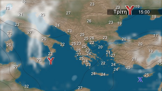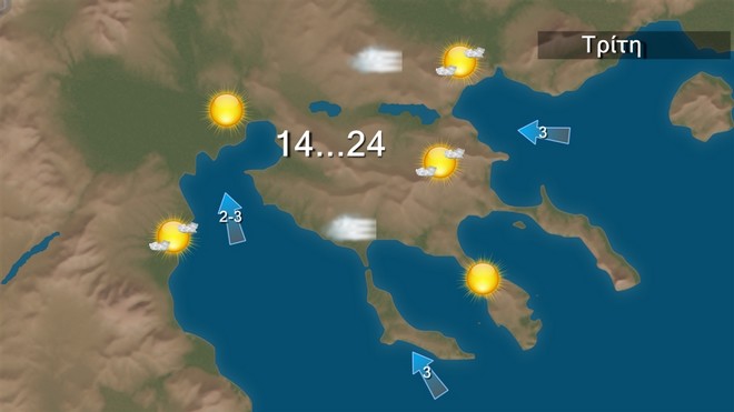 Την Τρίτη σε όλη τη χώρα προβλέπεται γενικά αίθριος καιρός με περιορισμένη ορατότητα το πρωί και τοπικές ομίχλες. Οι άνεμοι θα πνέουν από βόρειες διευθύνσεις στο Αιγαίο 5 με 6 και τοπικά έως 7 μποφόρ. Η θερμοκρασία θα φτάσει τους 27 βαθμούς στα βόρεια, στα υπόλοιπα ηπειρωτικά και το Ιόνιο τους 26 με 28 και στα νησιά του Αιγαίου τους 24 με 26 βαθμούς Κελσίου και τοπικά στη νότια Κρήτη τους 28.