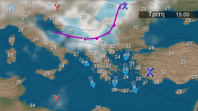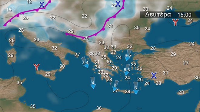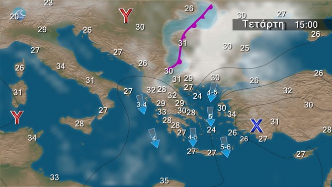Αίθριος καιρός, με πρόσκαιρες νεφώσεις τις μεσημβρινές και απογευματινές ώρες στα ορεινά της δυτικής και της βόρειας ηπειρωτικής χώρας. Οι άνεμοι θα πνέουν στα δυτικά δυτικοί βορειοδυτικοί 3 με 4 και πρόσκαιρα το μεσημέρι έως 5 μποφόρ. Στην υπόλοιπη χώρα, από βόρειες διευθύνσεις 3 με 5 και στο Αιγαίο τοπικά 6 μποφόρ. Η θερμοκρασία δεν θα σημειώσει αξιόλογη μεταβολή και θα φτάσει στα ηπειρωτικά τους 36 με 37 και στα νησιά τους 33 με 35 βαθμούς Κελσίου.