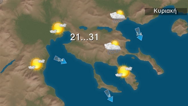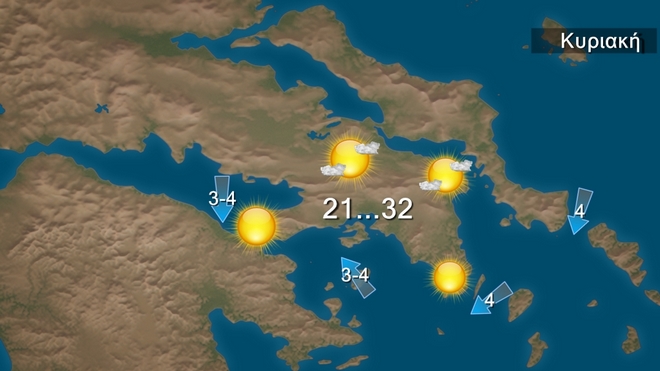 Την Κυριακή θα επικρατήσει γενικά αίθριος καιρός και μόνο στα βόρεια θα έχουμε λόγω αστάθειας τοπικές μπόρες το μεσημέρι Οι άνεμοι θα πνέουν από βόρειες διευθύνσεις 4-5 και στο Ιόνιο τοπικά 5-6 6 μποφόρ. Η θερμοκρασία δεν θα σημειώσει αξιόλογη μεταβολή και θα έχει μέγιστη τιμή στα βόρεια τους 33 βαθμούς στα υπόλοιπα ηπειρωτικά και το Ιόνιο τους 31 με 34 και στα νησιά του Αιγαίου τους 31 βαθμούς Κελσίου