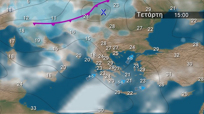 Γενικά αίθριος καιρός. Στα ηπειρωτικά τις μεσημβρινές και απογευματινές ώρες θα αναπτυχθούν νεφώσεις και θα εκδηλωθούν τοπικοί όμβροι η μεμονωμένες καταιγίδες στα δυτικά και βόρεια ορεινά. Οι άνεμοι θα πνέουν δυτικοί βορειοδυτικοί 3 με 5 και στα νότια τοπικά 6 μποφόρ. Η θερμοκρασία θα σημειώσει μικρή άνοδο στα ανατολικά.