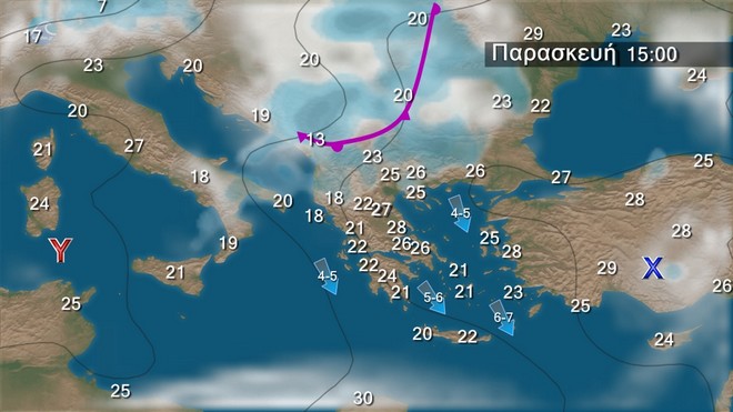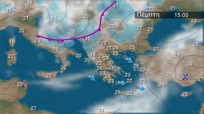 Στα δυτικά, κεντρικά και βόρεια λίγες νεφώσεις παροδικά αυξημένες με τοπικούς όμβρους και σποραδικές καταιγίδες κυρίως τις μεσημβρινές και απογευματινές ώρες στα βορειοανατολικά όπου πιθανώς πρόσκαιρα θα είναι κατά τόπους ισχυρές. Στα υπόλοιπα γενικά αίθριος καιρός και μόνο στα ηπειρωτικά θα αναπτυχθούν πρόσκαιρες νεφώσεις τις μεσημβρινές και απογευματινές ώρες με τοπικούς όμβρους στα ορεινά. Οι άνεμοι θα πνέουν από δυτικές διευθύνσεις 4 με 6 και στα νότια έως 7 μποφόρ. Η θερμοκρασία δε θα σημειώσει αξιόλογη μεταβολή.