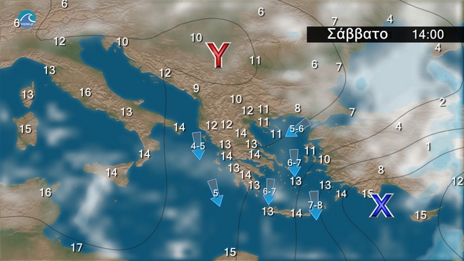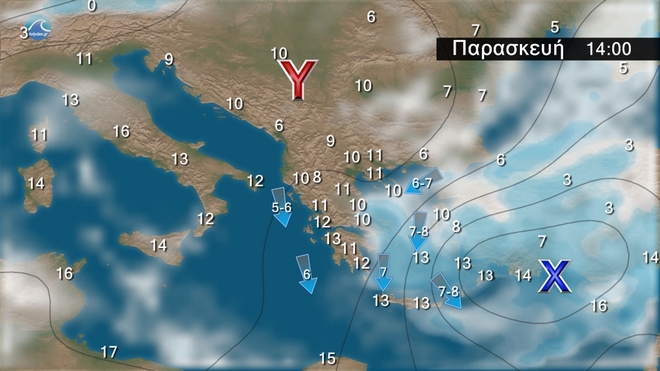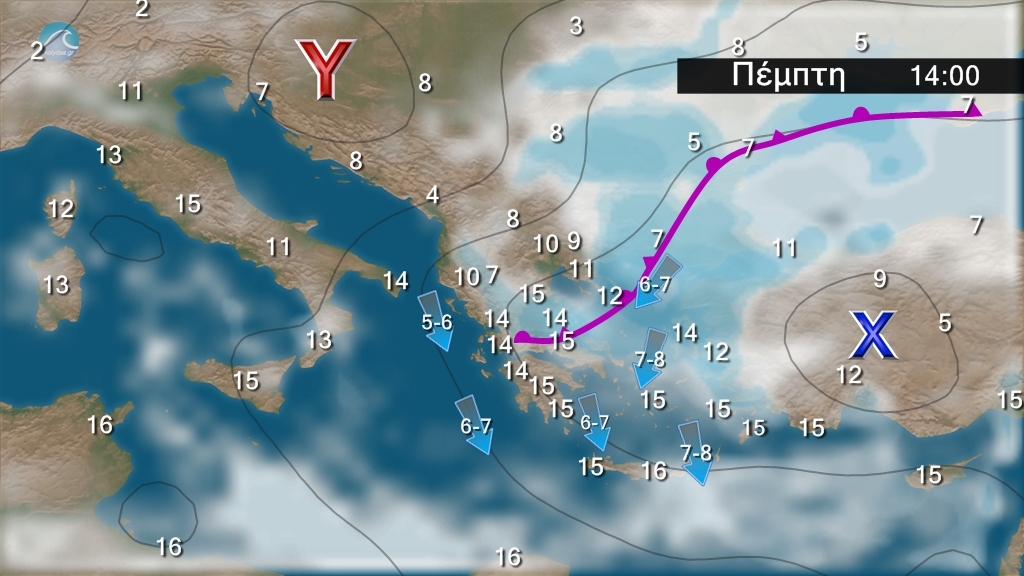 Νεφώσεις με βροχές και σποραδικές καταιγίδες, αρχικά στα δυτικά και γρήγορα και στην υπόλοιπη χώρα. Τα φαινόμενα πιθανώς να είναι κατά τόπους ισχυρά αρχικά στα δυτικά και βαθμιαία στα νησιά του βορείου και ανατολικού Αιγαίου. Χιονοπτώσεις θα σημειωθούν στα ηπειρωτικά ορεινά. Από το βράδυ στα βορειοδυτικά τα φαινόμενα θα εξασθενήσουν. Οι άνεμοι θα πνέουν νοτιοδυτικοί 4 με 6 και σταδιακά τοπικά 7 μποφόρ. Βαθμιαία στα δυτικά, τα κεντρικά και τα βόρεια θα στραφούν σε βορείων διευθύνσεων, 6 με 7 και στα πελάγη τοπικά 8 μποφόρ. Η θερμοκρασία θα σημειώσει πτώση στα δυτικά, τα κεντρικά και τα βόρεια. Παγετός θα σημειωθεί κατά τόπους στα βόρεια ηπειρωτικά τις βραδινές ώρες.