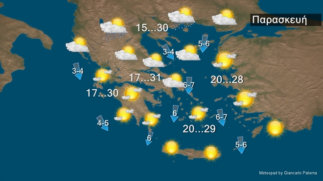Στα ανατολικά ηπειρωτικά, την Εύβοια, τις Κυκλάδες και τη βόρεια Κρήτη λίγες νεφώσεις που βαθμιαία θα αυξηθούν και θα σημειωθούν τοπικές βροχές μέχρι το απόγευμα. Στην υπόλοιπη χώρα γενικά αίθριος καιρός με πρόσκαιρες νεφώσεις τις μεσημβρινές και απογευματινές ώρες στα ηπειρωτικά, όπου θα εκδηλωθούν τοπικοί όμβροι ή μεμονωμένες καταιγίδες, κυρίως στα ορεινά. Οι άνεμοι θα πνέουν από βόρειες διευθύνσεις, στα δυτικά 3 με 5, στα ανατολικά 4 με 6 και βαθμιαία στο Αιγαίο τοπικά 7 μποφόρ. Η θερμοκρασία στα ηπειρωτικά θα κυμαίνεται στα κανονικά για την εποχή επίπεδα.