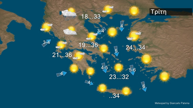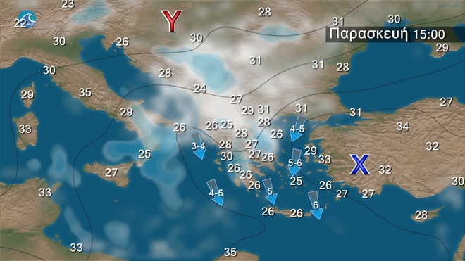 Λίγες νεφώσεις τοπικά αυξημένες κυρίως στα ηπειρωτικά όπου θα σημειωθούν τοπικές βροχές και κατά διαστήματα σποραδικές καταιγίδες. Οι άνεμοι θα πνέουν από βόρειες διευθύνσεις, στα δυτικά 3 με 5 και στα ανατολικά 4 με 6 μποφόρ. Η θερμοκρασία δεν θα σημειώσει αξιόλογη μεταβολή