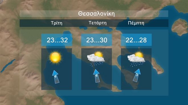 Στη Θεσσαλονίκη ο καιρός θα κυλήσει με παροδική συννεφιά και αστάθεια την Τετάρτη και Πέμπτη . Η μέγιστη θερμοκρασία θα πέσει από τους 32 βαθμούς την Τρίτη στους 28 την ερχόμενη Πέμπτη.