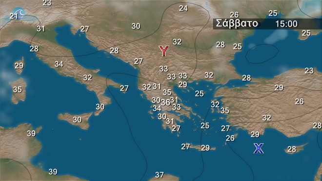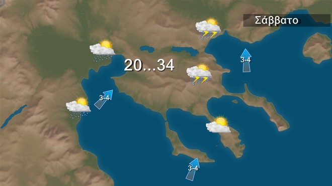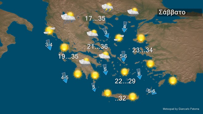 Το Σάββατο προβλέπεται γενικά αίθριος καιρός. Στα ηπειρωτικά τις μεσημβρινές και απογευματινές ώρες θα αναπτυχθούν πρόσκαιρες νεφώσεις και θα εκδηλωθούν τοπικοί όμβροι και μεμονωμένες καταιγίδες κυρίως στα ορεινά. Οι άνεμοι θα πνέουν από βόρειες διευθύνσεις 3 με 5 και στο Αιγαίο 5 με 6 μποφόρ. Η θερμοκρασία θα σημειώσει πτώση και θα κυμανθεί σε κανονικά για την εποχή επίπεδα με μέγιστη θερμοκρασία στα βόρεια τους 35 βαθμούς στα υπόλοιπα ηπειρωτικά και το Ιόνιο τους 35 με 36 και στο Αιγαίο τους 29 με 34 βαθμούς Κελσίου.