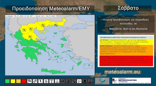 Το Σάββατο θα υποχωρήσει η θερμοκρασία θα επανέλθει σε κανονικές για την εποχή τιμές. Υπάρχει προειδοποίηση με κίτρινο χρώμα για τις σποραδικές καταιγίδες που θα εκδηλωθούν κυρίως στα κεντρικά και τα βόρεια.