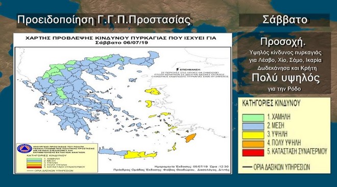 Από πλευράς επικινδυνότητας πυρκαγιών θα έχουμε υψηλή κατηγορία κινδύνου για πυρκαγιές στη Λέσβο, Χίο, Σάμο, Ικαρία, Δωδεκάνησα και Κρήτη και πολύ υψηλό κίνδυνο πυρκαγιάς για την Ρόδο σύμφωνα με την πρόβλεψη της Γενικής Γραμματείας Πολιτικής Προστασίας.