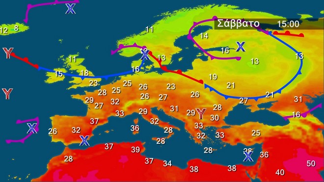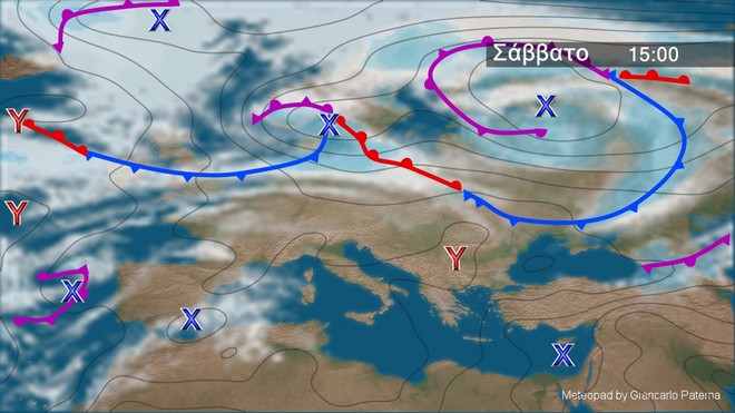 Στον γενικό χάρτη της Ευρώπης διακρίνονται τα χαμηλά που επηρεάζουν τη βόρεια Ευρώπη ενώ διατηρείται ο αντικυκλώνας της Βαλκανικής που συνδυάζεται με το χαμηλό της ανατολικής Μεσογείου και προκαλεί τους ενισχυμένους βοριάδες στα ανατολικά τμήματα του Αιγαίου.