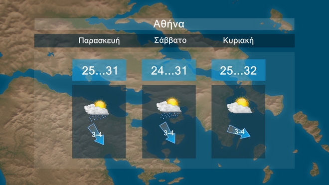 Στην Αττική ο καιρός θα είναι άστατος με φαινόμενα κυρίως το μεσημέρι και το απόγευμα τοπικά έντονα. Οι άνεμοι θα είναι μεταβλητοί και τοπικά νοτιοδυτικοί 3 με 4 μποφόρ. Η θερμοκρασία δεν θα ξεπεράσει τους 30 βαθμούς Κελσίου.