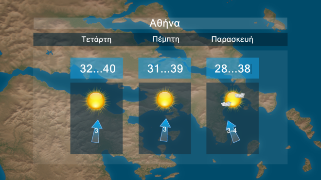 Στην Αθήνα προβλέπεται σχεδόν αίθριος καιρός Η θερμοκρασία θα έχει μέγιστες τιμές περί τους 38 με 40 βαθμούς Κελσίου.