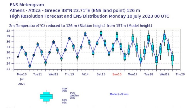 Στο παραπάνω μετεώγραμμα, το οποίο αποτελεί ένα βασικό εργαλείο για τις προγνώσεις διακρίνουμε μέσες θερμοκρασίες στους 40 με 41 βαθμούς Κελσίου για την Αθήνα από τα πιθανολογικά “κουτιά”, τα οποία αγγίζουν και λίγο υψηλότερες τιμές. Από την Κυριακή και μετά τα διαστήματα (εύρη θερμοκρασιών) γίνονται μεγαλύτερα και για τον λόγο αυτόμ περιοριζόμαστε στις προγνώσεις μας με τιμές έως το ερχόμενο Σάββατο.