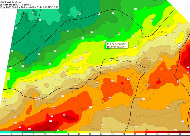 Ο χάρτης των 850 hPa μας δίνει το θερμοκρασιακό προφίλ της ατμόσφαιρας σε υψόμετρο 1500 μέτρων από την επιφάνεια της θάλασσας την Παρασκευή 14 Ιουλίου 2023.