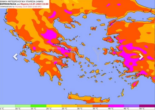 - Στη νησιωτική χώρα η μέγιστη τιμή της θερμοκρασίας θα φθάσει τους 35 με 36 και στα νησιά του Ιονίου, τα νησιά του ανατολικού Αιγαίου, τα Δωδεκάνησα και τη νότια Κρήτη τους 37 με 39 βαθμούς Κελσίου ενώ οι ελάχιστες τιμές της θα κυμανθούν περί τους 27 με 29 βαθμούς. Τα μεγάλα αστικά κέντρα και ιδιαίτερα η Αττική περιλαμβάνονται μέσα στις περιοχές με μωβ χρωματισμό και με τιμές πάνω από τους 40 βαθμούς Κελσίου.
